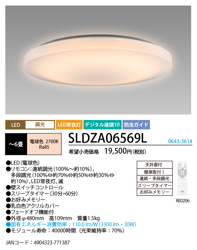 - 制御機能:リモコン/連続調光:100%~約10%、多段調光:100%⇔約70%⇔約50%⇔約30%⇔約10%、LED常夜灯、滅/壁スイッチコントロール