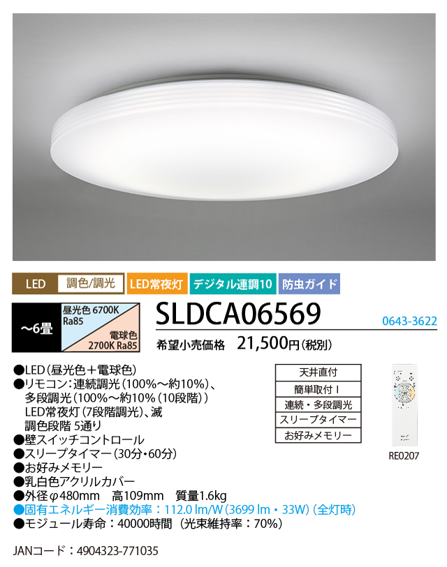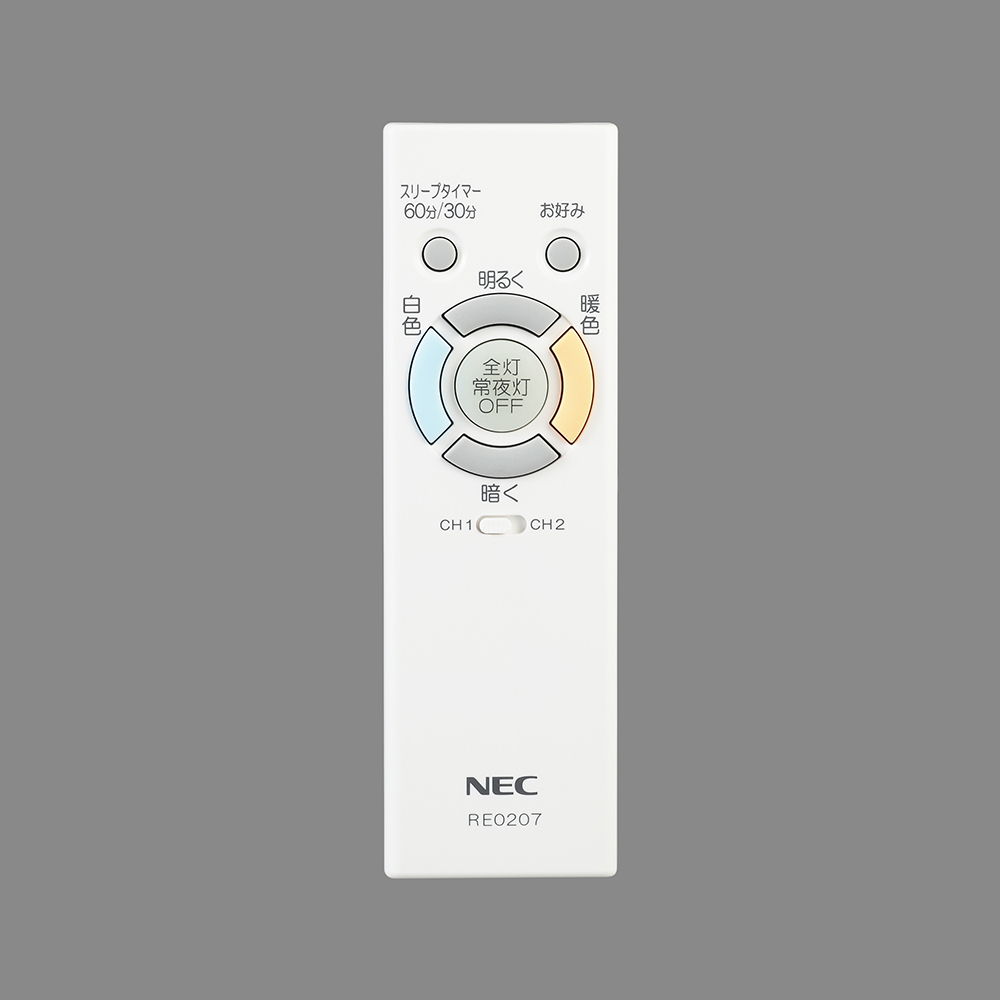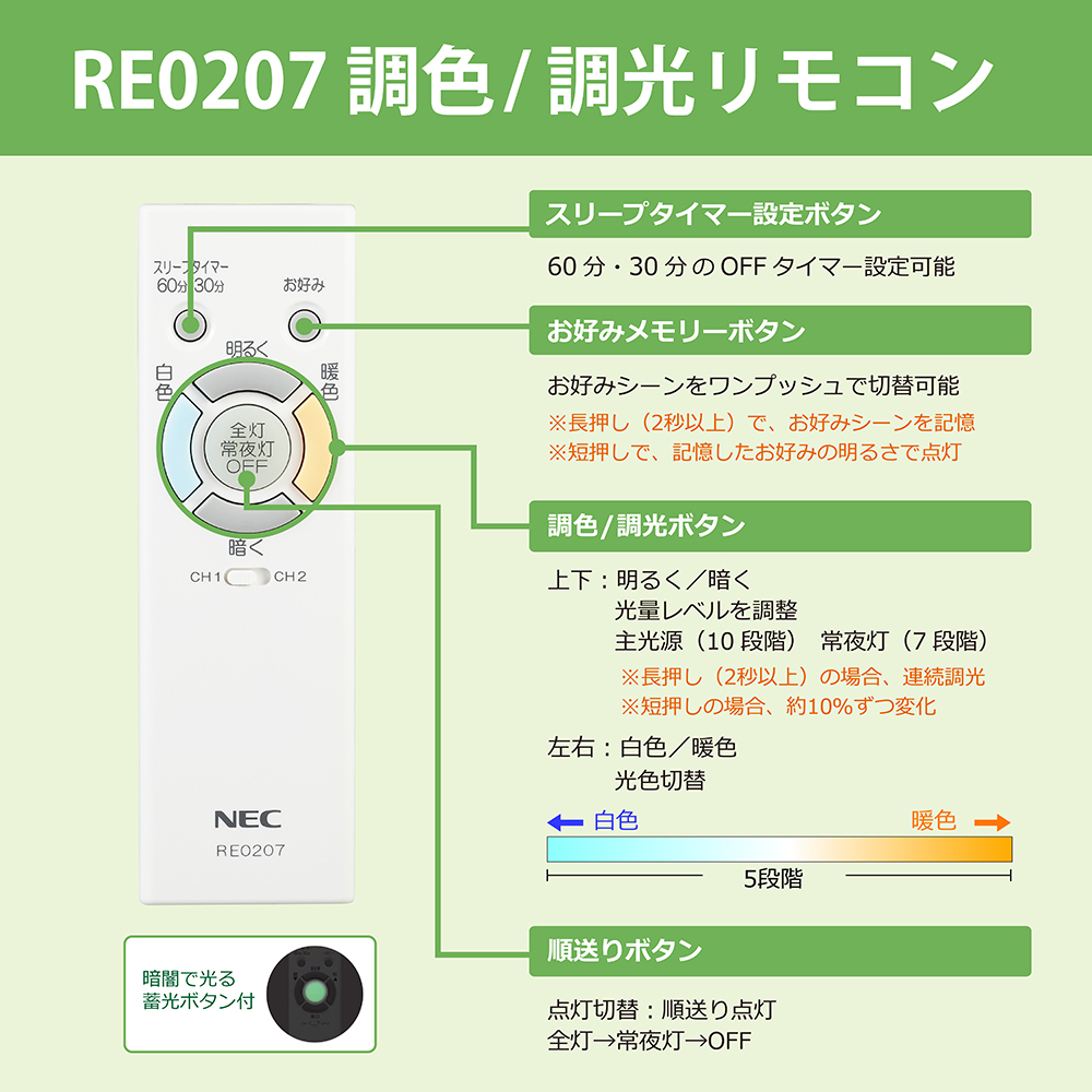 - 制御機能:リモコン/連続調光:100%~約10%、多段調光:100%~約10%(10段階)、LED常夜灯(7段階調光)、滅/調色段階5通り(ダイレクトあかり選択:アクティブ、ナチュラル、リラックスの3段階を含む)/壁スイッチコントロール