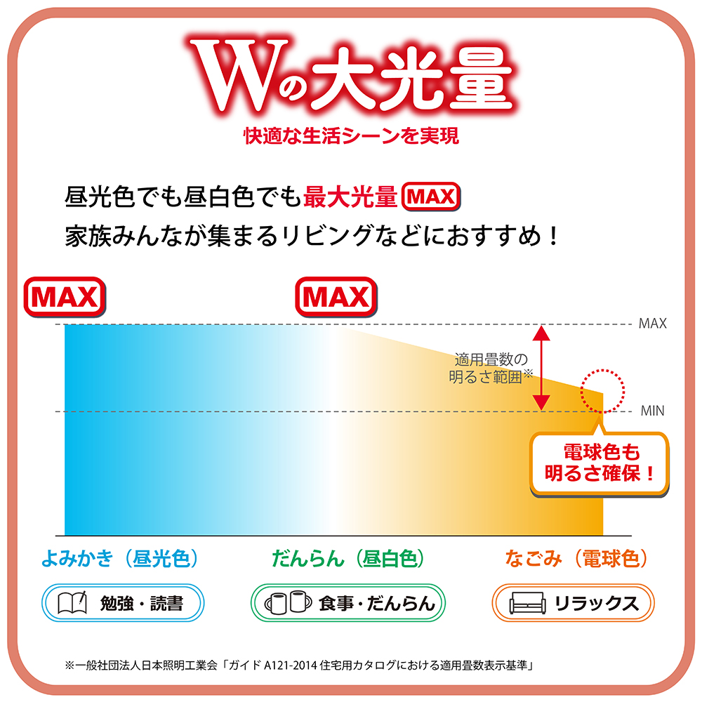 アクティブ(昼光色)、ナチュラル(昼白色)、リラックス(電球色)の3つのあかりモードを搭載
