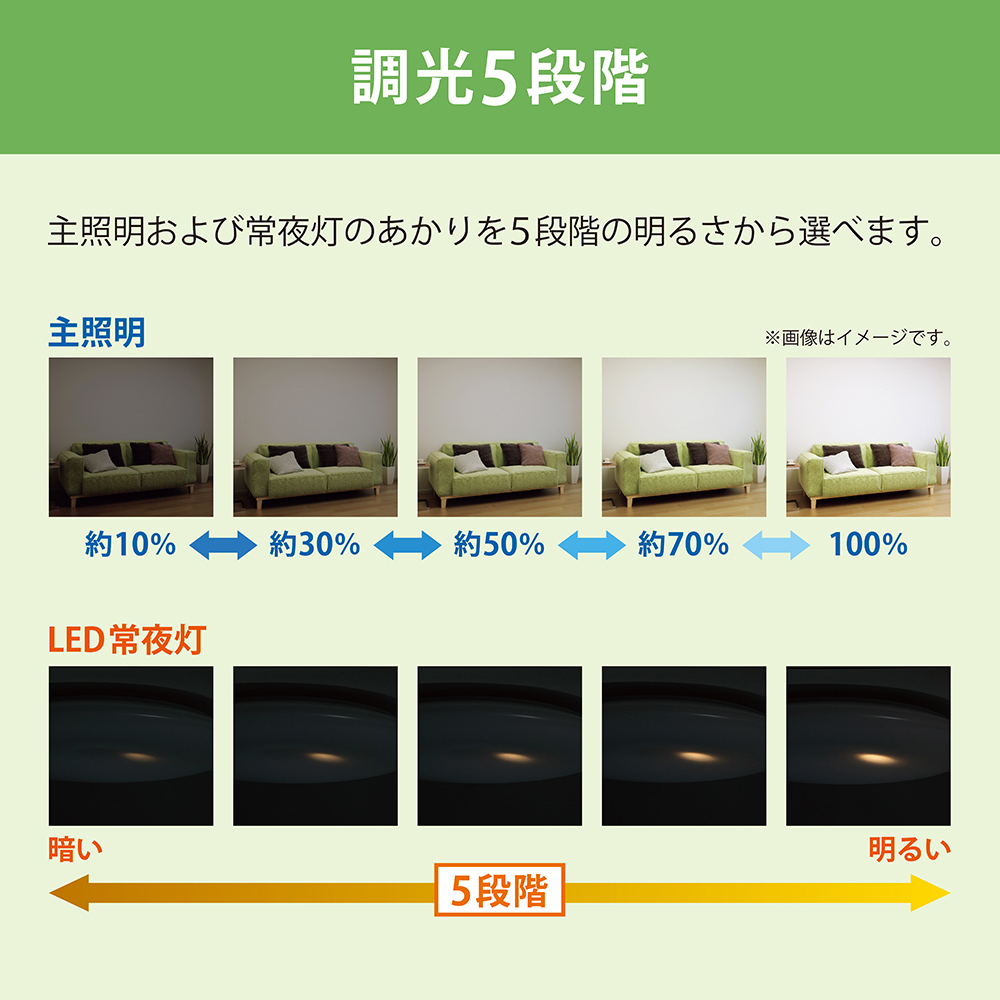 - 制御機能:リモコン:多段調光(100%⇔約70%⇔約50%⇔約30%⇔約10%)、LED常夜灯(5段階調光)、滅/壁スイッチコントロール