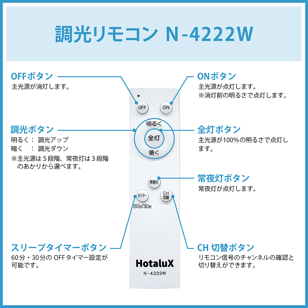 - 制御機能:リモコン:多段調光(5段階)、LED常夜灯(3段階調光)、滅/壁スイッチコントロール