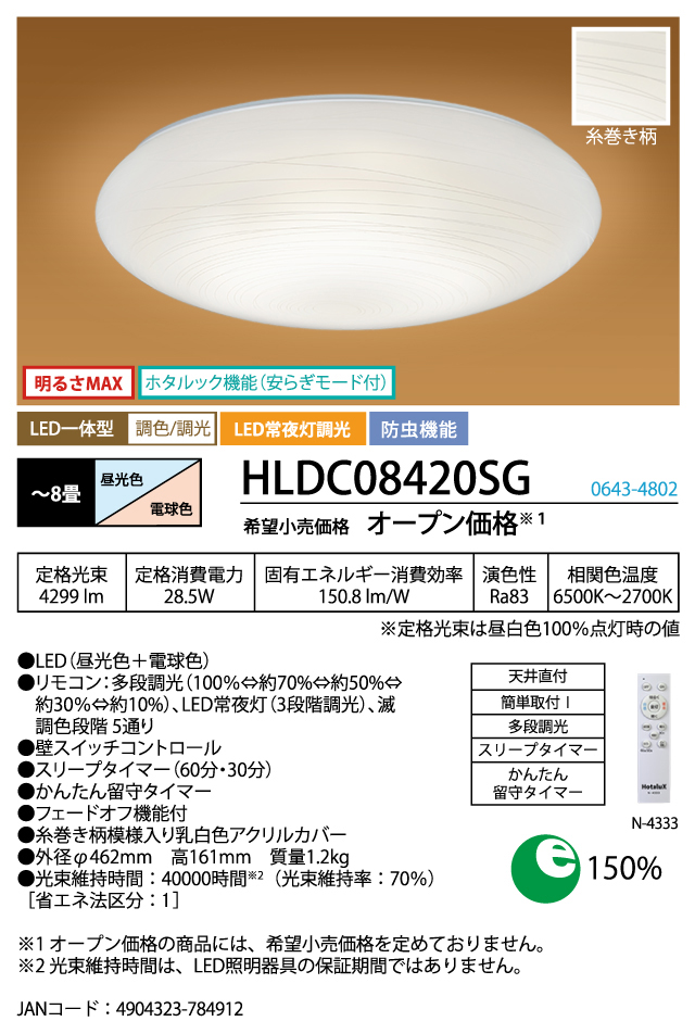 - 制御機能:リモコン:多段調光(100%⇔約70%⇔約50%⇔約30%⇔約10%)、LED常夜灯(3段階調光)、滅/調色段階5通り/壁スイッチコントロール