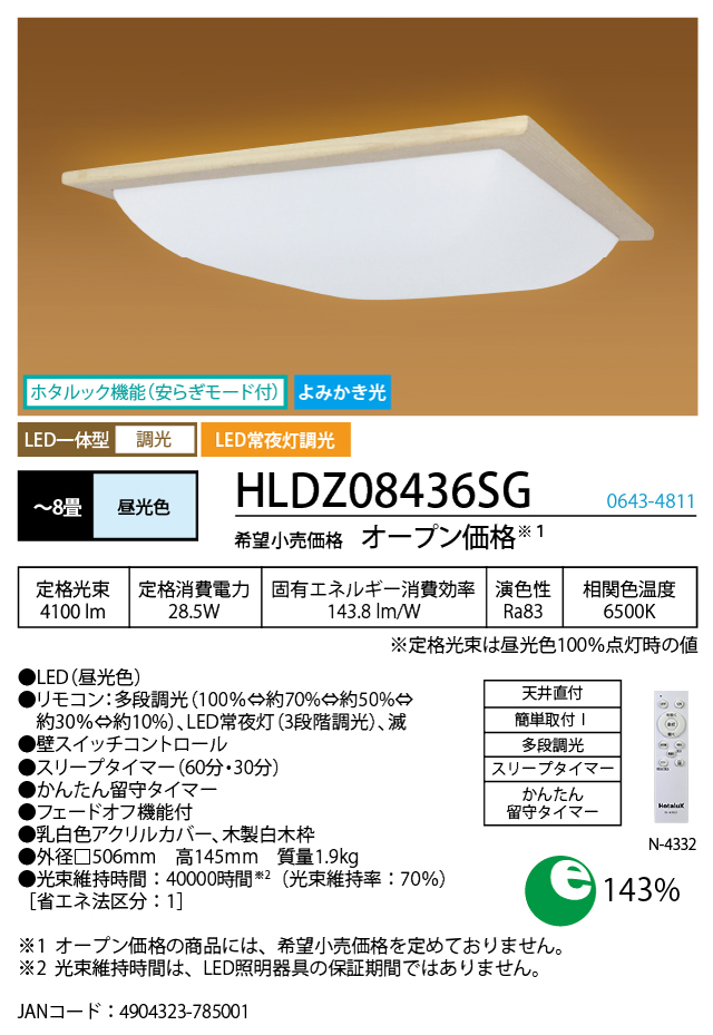 - 制御機能:リモコン:多段調光(100%⇔約70%⇔約50%⇔約30%⇔約10%)、LED常夜灯(3段階調光)、滅/壁スイッチコントロール