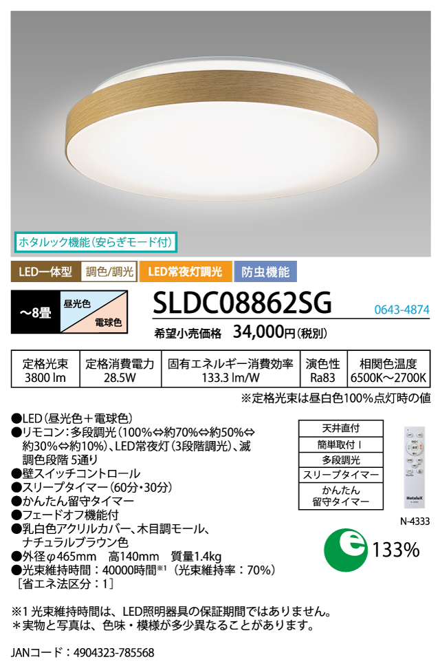 - 制御機能:リモコン:多段調光(100%⇔約70%⇔約50%⇔約30%⇔約10%)、LED常夜灯(3段階調光)、滅/調色段階5通り/壁スイッチコントロール