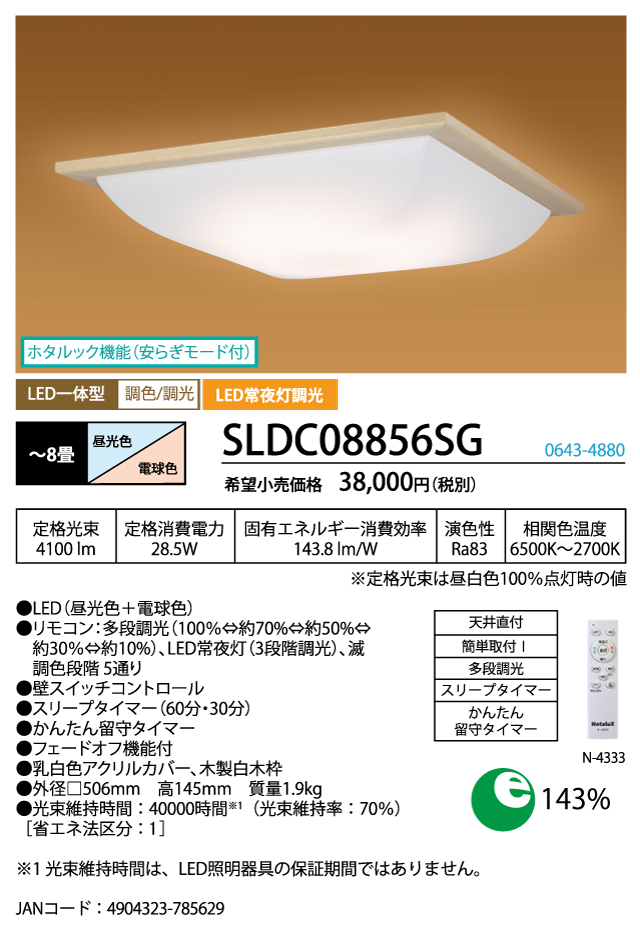 - 制御機能:リモコン:多段調光(100%⇔約70%⇔約50%⇔約30%⇔約10%)、LED常夜灯(3段階調光)、滅/調色段階5通り/壁スイッチコントロール
