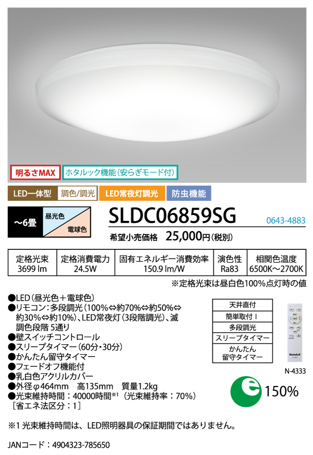 - 制御機能:リモコン:多段調光(100%⇔約70%⇔約50%⇔約30%⇔約10%)、LED常夜灯(3段階調光)、滅/調色段階5通り/壁スイッチコントロール