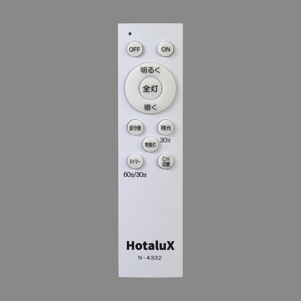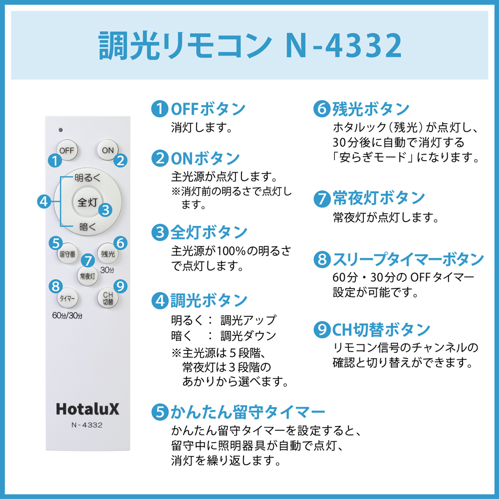 - 制御機能:調光:「明るく」 「暗く」(多段調光:5段階) 安らぎモード、スリープタイマー(60分/30分)、かんたん留守タイマー、常夜灯 照明点灯/消灯:ON、OFF、全灯