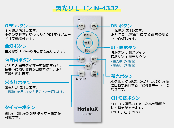 照明のON/OFFだけでなく、かんたん留守タイマーやスリープタイマーなど、便利なタイマー機能を簡単に設定することができます。