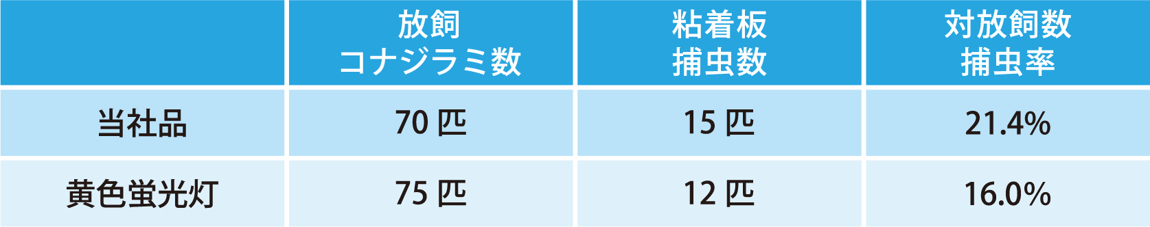 外部試験先にて黄色蛍光灯より約1.3倍多く誘引されたことを確認済み
