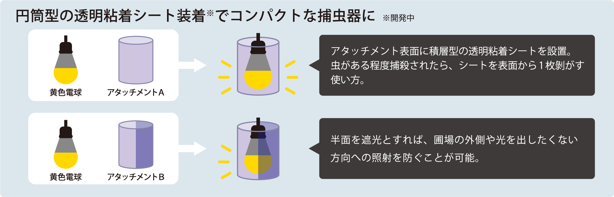 自発光する黄色電球で強力に誘引し、捕殺に加え予察にもなり一石二鳥